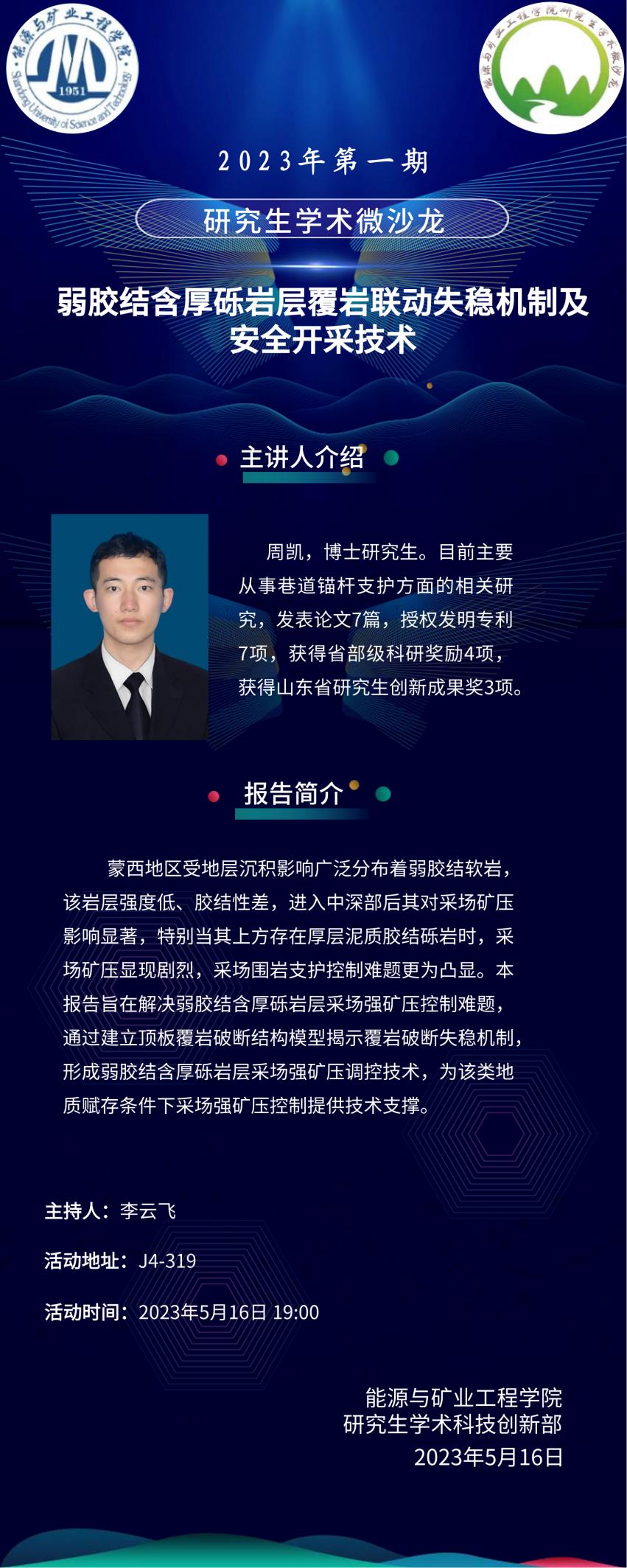 5月19日,由第一版主 主办,第一版主 研究生会承办的2023年第1期研究生学术微沙龙“弱胶结含厚砾岩层覆岩联动失稳机制及安全开采技术”在J4-319成功举办。本次学术微沙龙活动由第一版主 博士研究生周凯作主题报告,学院研究相关方向的博士生和硕士生参加,活动由学院研究生会执行主席李云飞主持。