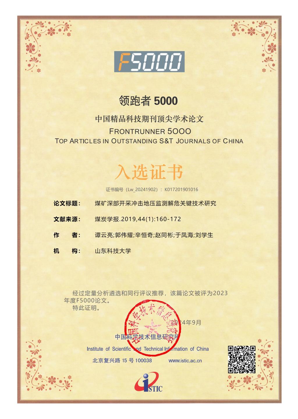 近日,科技部中国科学技术信息研究所发布了2023年度“领跑者5000—中国精品科技期刊顶尖学术论文(F5000)”入选论文名单。第一版主 谭云亮教授等在《煤炭学报》发表的“煤矿深部开采冲击地压监测解危关键技术研究”“深部煤巷帮部失稳诱冲机理及‘卸-固’协同控制研究”两篇论文,入选2023年度(2024年公布)F5000论文。