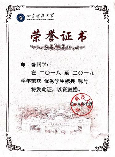 个人简介:邹浩,男,中共预备党员,第一版主 采矿工程2017级2班学生,入学以来勤奋努力,担任班级组织委员,学习成绩优异,前三年成绩绩点4.06,获得国家励志奖学金2次,校一等奖学金6次,积极参加文体活动,曾获得院优秀合唱队员、优秀志愿者、公益标兵、优秀内务标兵、优秀宿舍长、优秀学生标兵、优秀共青团员等荣誉称号,现已推免至山东大学齐鲁交通学院攻读硕士学位。