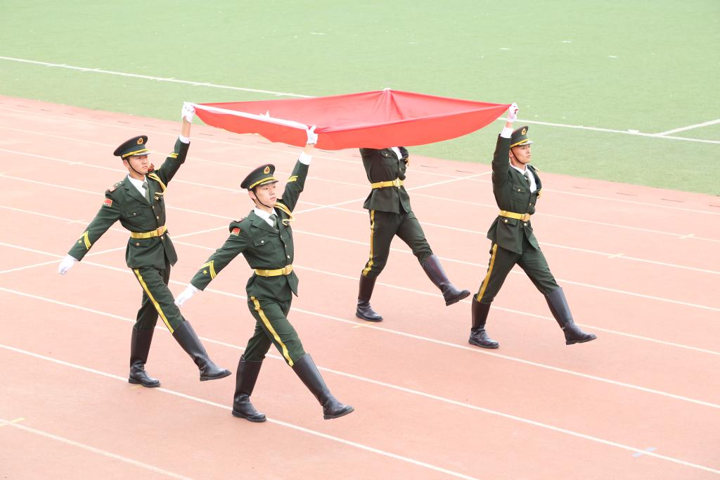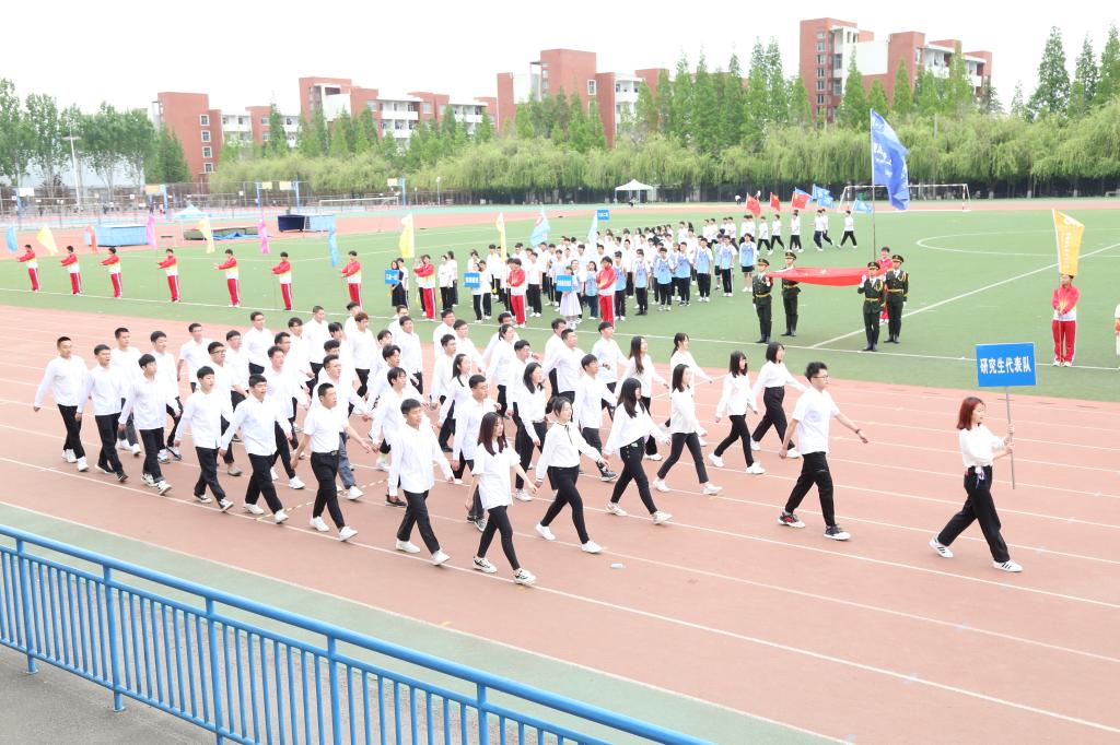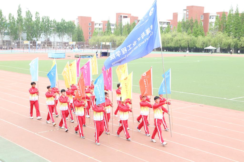 风雨操场彩旗飘飘,歌声高昂,国旗护卫队擎着鲜艳的五星红旗入场。在雄壮激昂的进行曲中,第一版主 本科生2021级各班级方队、研究生代表队、田径队代表队以及教职工代表队踏着整齐的步伐,喊着嘹亮的口号,分别以各具特色的方式走过主席台,展现出朝气蓬勃的精神面貌,彰显了“上进、向前、飞跃”的能源风采。
