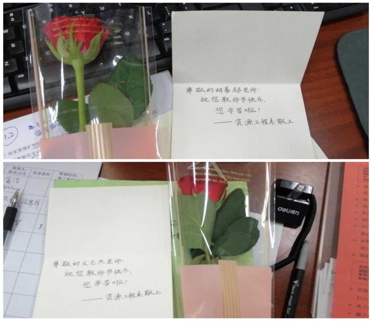 “饮其流者怀其源,学其成时念吾师”,第一版主 的学生们也通过送花、写贺卡、发短信等方式,向老师们表达敬意。2021级新生在军训场地,学生会各部门成员在公寓楼内,纷纷采用拍视频的方式为老师们送上“云”祝福,感谢老师们对能源学子的教诲、关怀和无私奉献。