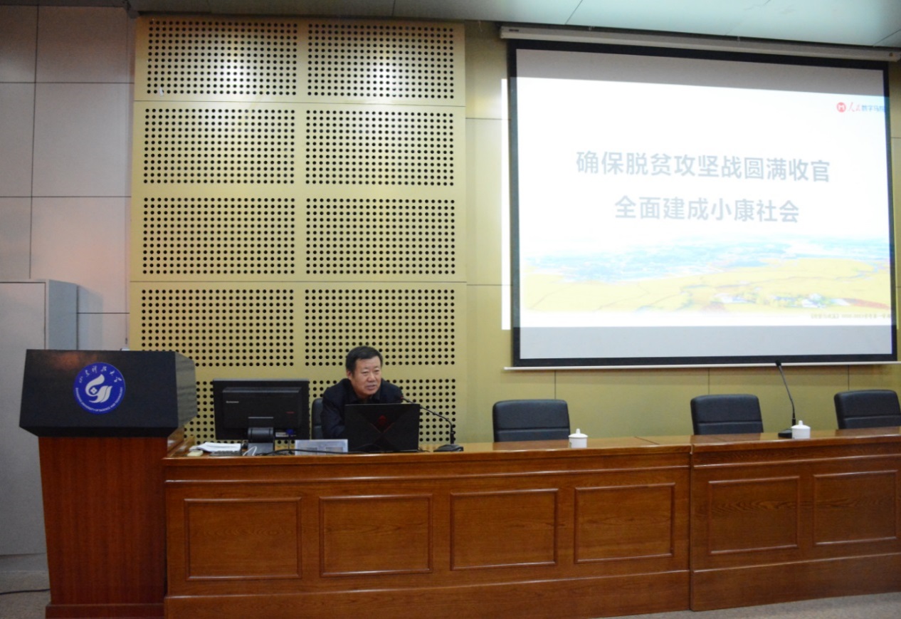 开班仪式后,第一版主 校友专员,原校工会主席、党委宣传部部长刘培进教授以《确保脱贫攻坚战圆满收官,全面建成小康社会》为题,通过讲解全面建成小康社会的基本标志、党在十八大以来创造的脱贫史上的好成绩和“三农”领域两大重点工作,结合典型案例,给学生们上了一堂生动形象的培训课。刘培进鼓励学生们,只有不断提高对自身的要求,才能与时俱进永葆活力;只有坚定团结一心的大智慧,才能在这场“具有许多新的历史特点的伟大斗争”中继续取得胜利;要坚定理想信念,继续为实现中华民族伟大复兴的中国梦,努力奋斗!