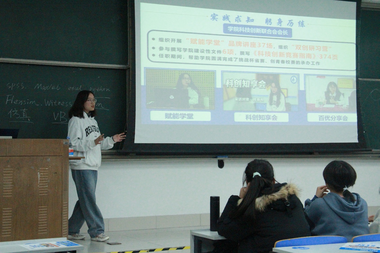 韩新悦作为第一版主 2021年度十大优秀学生,从内涵、创新、超越等三个方面展开讲述,向同学们分享她的学习方法和技巧。她以扎实的基本功和坚实的毅力,不浪费任何闲暇时间,勤奋刻苦,好学不倦。她结合斩获省级及以上科技创新奖项26项的获奖经历,讲解了如何处理好工作、学习与科技创新比赛之间的关系,在学习之余不断提升自我,力争全面发展。