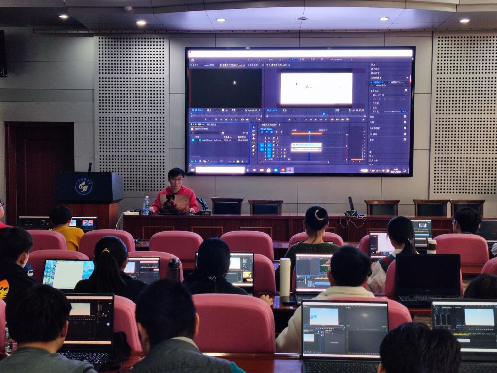 培训中,王元昊介绍了几种主流的视频处理软件,并对Pr和Ae软件的用途和基础知识、使用界面的调节方法以及拓展操作等方面进行了细致的讲解。通过演示操作,使同学们对视频剪辑软件的基础功能有了一定的了解。在讲解过程中,王元昊结合个人工作经历,通过播放自己剪辑的视频作品,为大家讲解了视频的修剪与拼接、视频音频的调整与修饰字幕的添加等各项实用的操作技能。他通过分享自己操作过程中出现过的失败经验,提醒同学们要多学、多练,进一步加深了同学们对软件的认识。