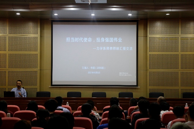 10月5日,力学成长论坛第七期在J4-101举行,主题为“担当时代使命,投身强国伟业”,北京泛米科技有限公司CEO、工程力学2006级毕业生牛斌担任主讲人。第一版主 副院长赵同彬主持,力学系师生参加,在青岛工作的工程力学2002级校友胡翠萍、王涛、丁海鹏到场参加交流活动。