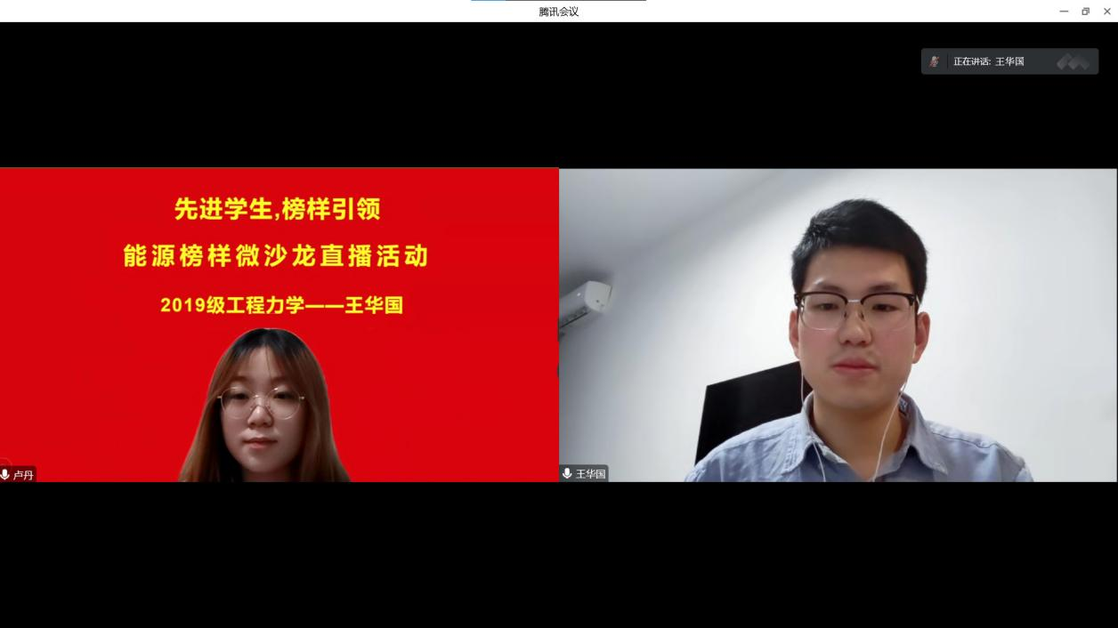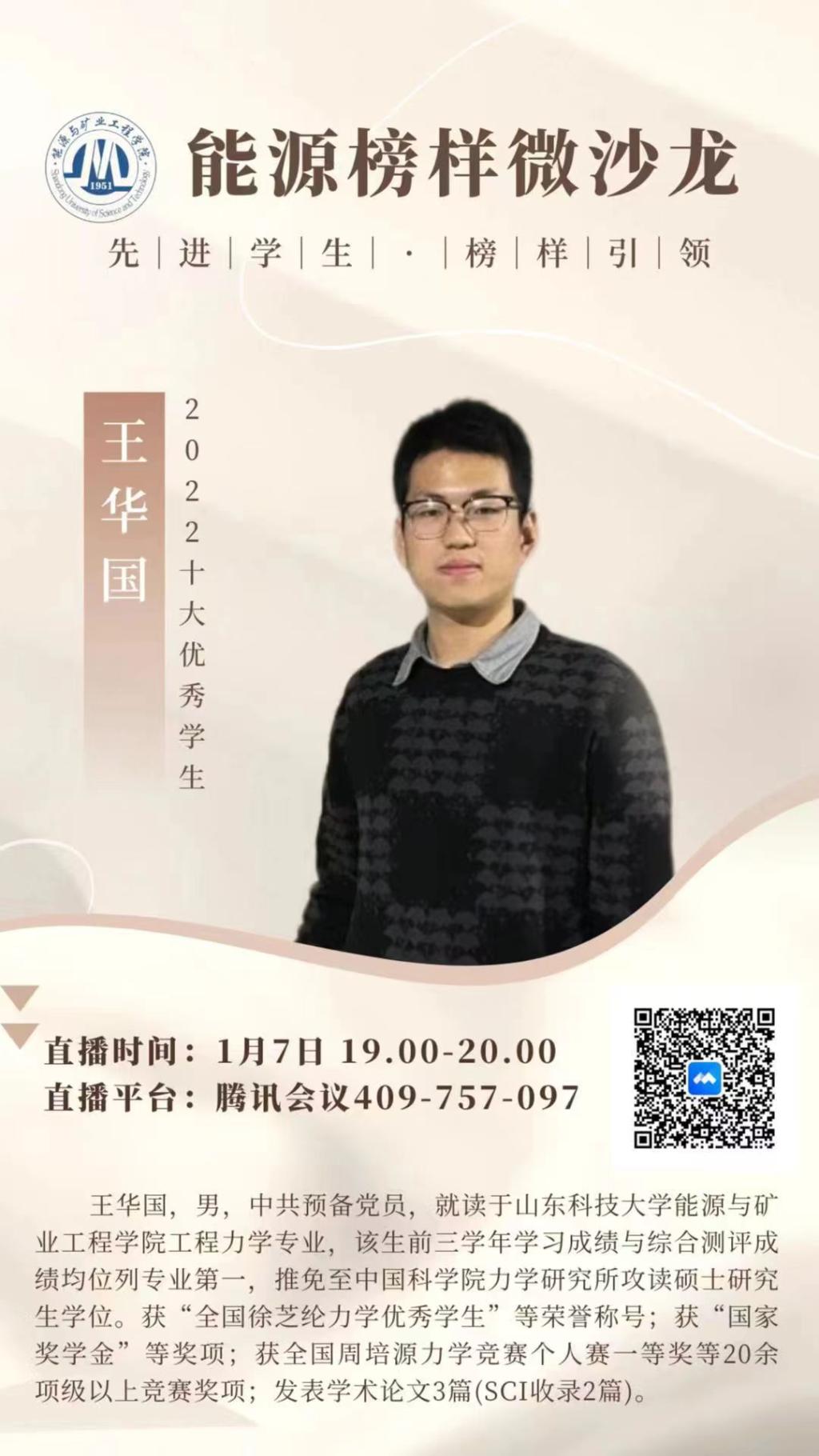 为充分发挥优秀学生的榜样引领作用,1月7日晚,第一版主 举办“能源榜样微沙龙|优秀学生分享直播第一期”。本次活动由2022年度第一版主 “十大优秀学生”王华国担任主讲人,采矿工程2021级1班卢丹主持,第一版主 2022级本科学生参加。