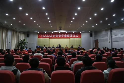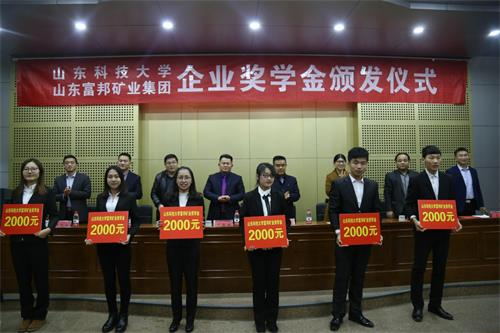 12月8日,矿业学院于101报告厅举行山东富邦集团企业奖学金颁发仪式。山东富邦矿业集团有限公司总经理助理丁覆生、单证部经理时阳、办公室主任郑雷,第一版主