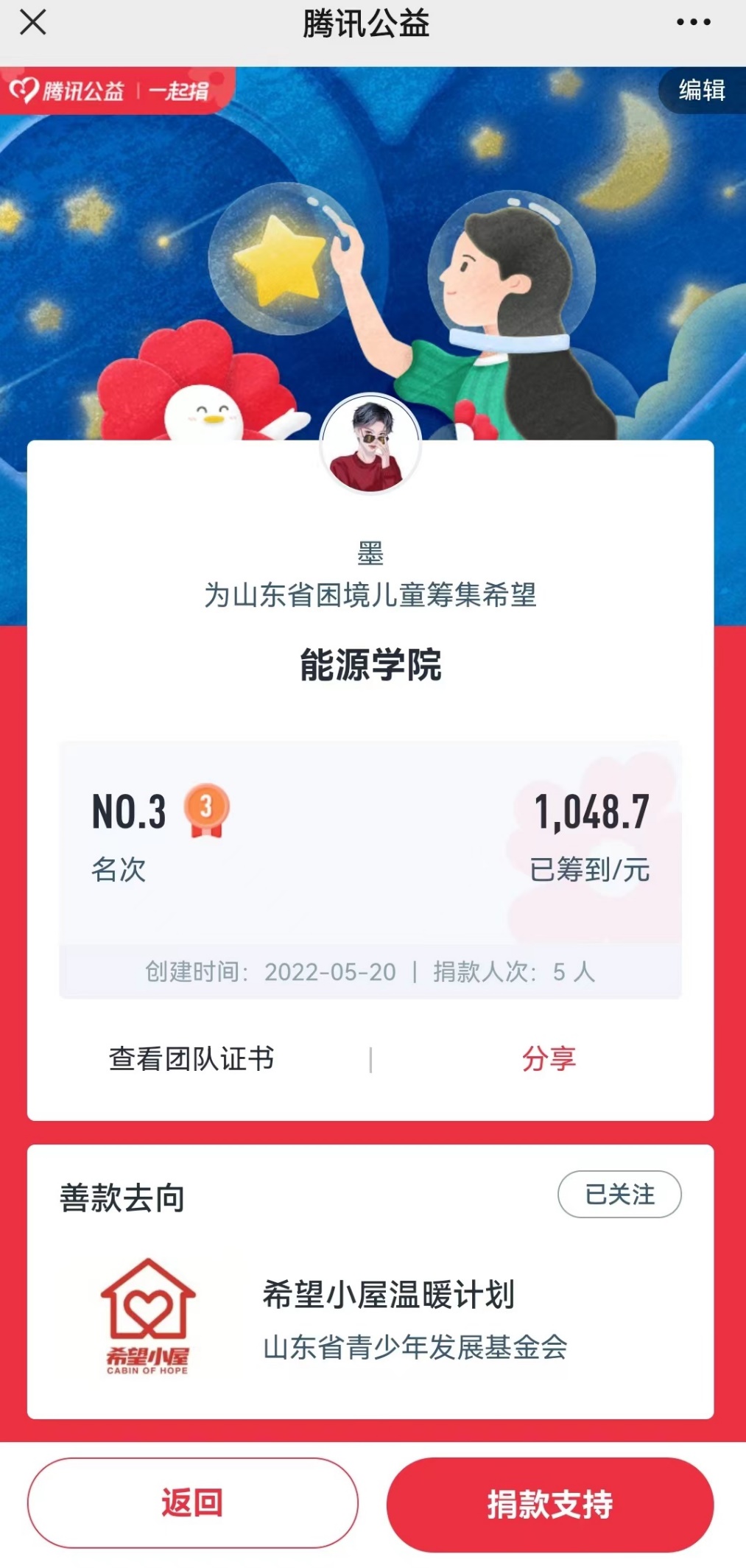 2021年5月20日至28日,第一版主 青年志愿者于校内开展了520公益日线上募捐宣传活动,通过“腾讯公益丨一起捐”线上平台建立第一版主 专属小队进行募捐,助力希望小屋儿童关爱项目。