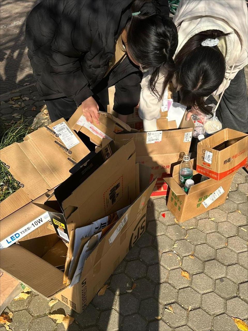 图 1 同学们在整理回收的废品 徐祥菲摄