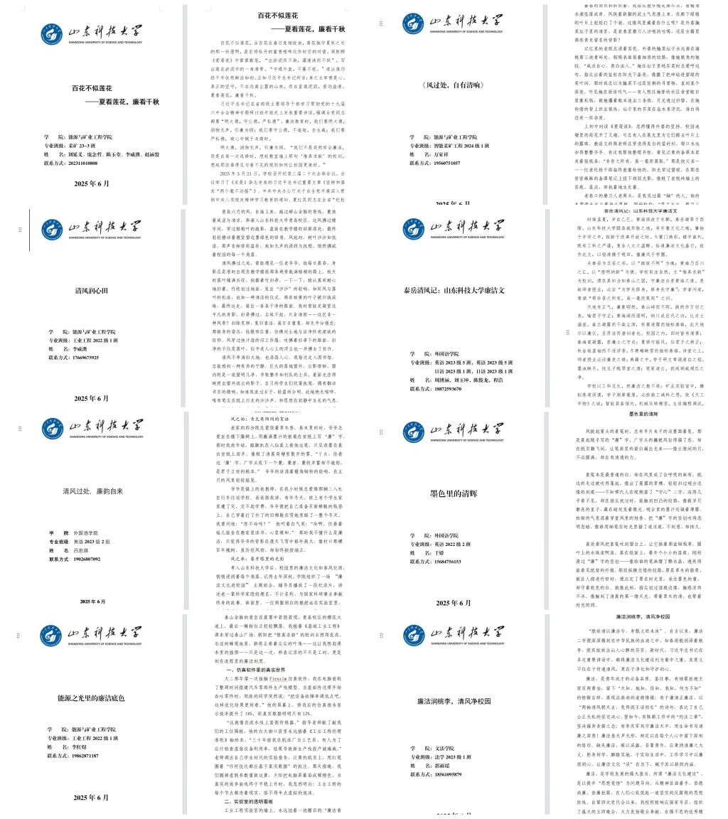 嘉源驿站内,清雅宁静的环境为创作提供了理想空间。同学们于书案前凝神运思,将“廉洁”这一宏大命题融入细腻笔端。他们或剖析历史长河中清官廉吏的卓然风骨,或结合专业所学,阐述强国建设中诚信守法、拒腐防变的职业坚守,字里行间流露出对清廉操守的真诚向往与坚定追求。一篇篇饱含深情的文字,既是对中华优秀廉洁文化的深情回望,更是对未来肩负强国重任时所需职业伦理与道德底线的清醒认知与庄严承诺。采矿工程2024级本科生董开启在文中写道:“矿山深处轰鸣的机械,其运转的基石是精密的齿轮,而支撑我们能源人职业生涯屹立不倒的,必将是如磐石般坚不可摧的廉洁操守。每一次严谨的数据记录,每一份公正的资源评估,都是对‘廉洁’最朴素的诠释。”