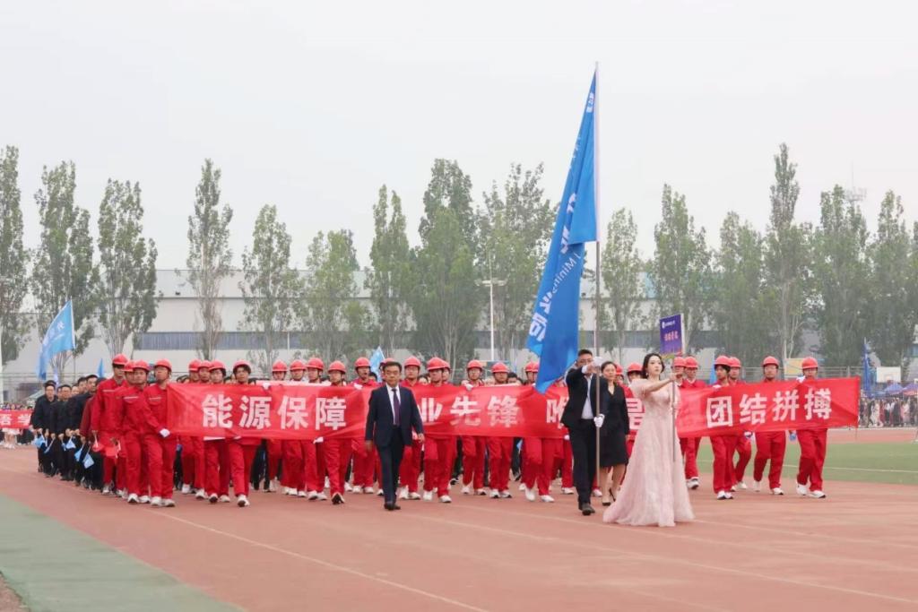 在雄壮激昂的进行曲中,第一版主 教师运动员代表身着统一的服装、学生运动员代表身着红色矿工服,以整齐的行进队列、饱满的精神面貌和铿锵有力的口号,展现出能源人锐意进取的体育精神。