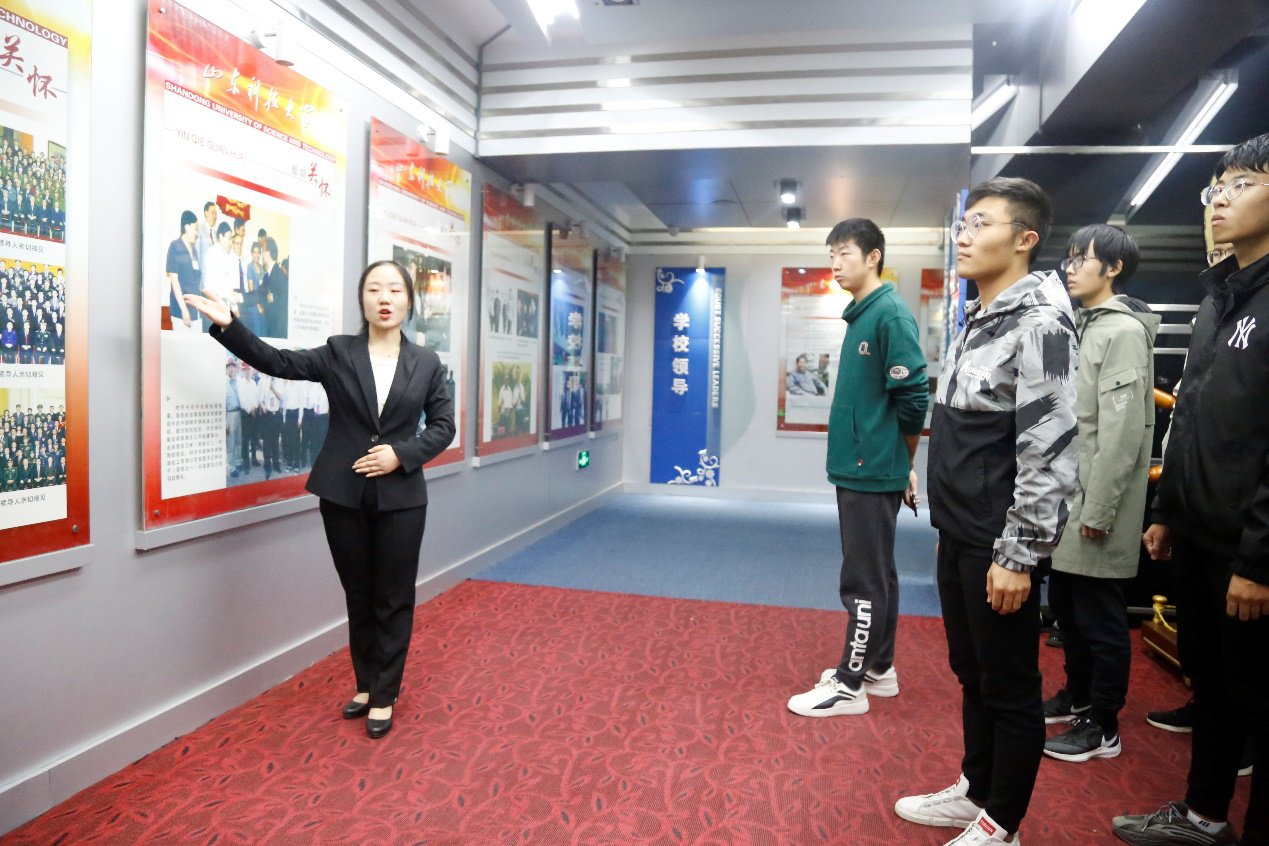 参观开始前,马鹤向同学们介绍了本次活动的意义,他希望同学们了解学校发展史,不忘初心,传承科大精神;不辱使命,争做优秀科大人。随后,同学们在解说员的带领下有序进入馆内,依次参观了殷切关怀、学校领导、桃李芬芳、建校历程及礼品陈列五部分。同学们通过对学校鸿基初创、艰难前行、探索前进、改革发展和世纪跨越五个关键发展时期的了解,学习科大人薪火相传的“惟真求新”精神,深刻感受科大人坚守理想信念、践行初心使命的情怀。