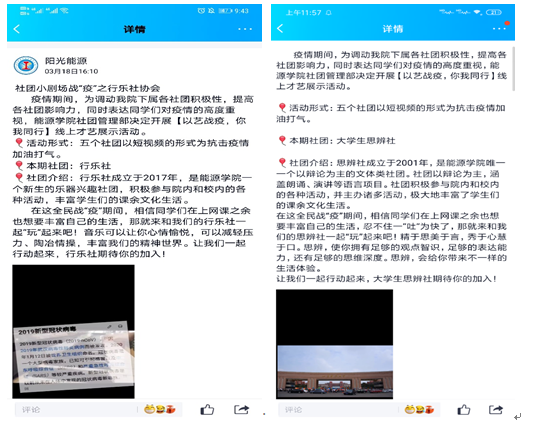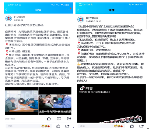 各社团通过短视频的形式,向同学们介绍社团发展、宣扬社团文化,让学生了解社团、走进社团并感受社团的特色。其中行乐社通过乐器表演,展现出同学们积极向上的精神风貌;大学生思辨社回顾以往辩论场上的精彩瞬间,让同学们仿佛置身于那唇枪舌剑的语言交锋中;棋艺社展示了各种棋类的比赛视频,严肃认真的棋手让同学们身临“棋”境;精武龙魂双截棍协会通过抖音短视频的形式,将威武霸气的双截棍与可爱呆萌的卡通人物结合,吸引了诸多同学的目光;国重实验室科创协会介绍了学院部分高端精密的实验仪器,讲解实验知识的同时激发了同学们对科研工作的兴趣。