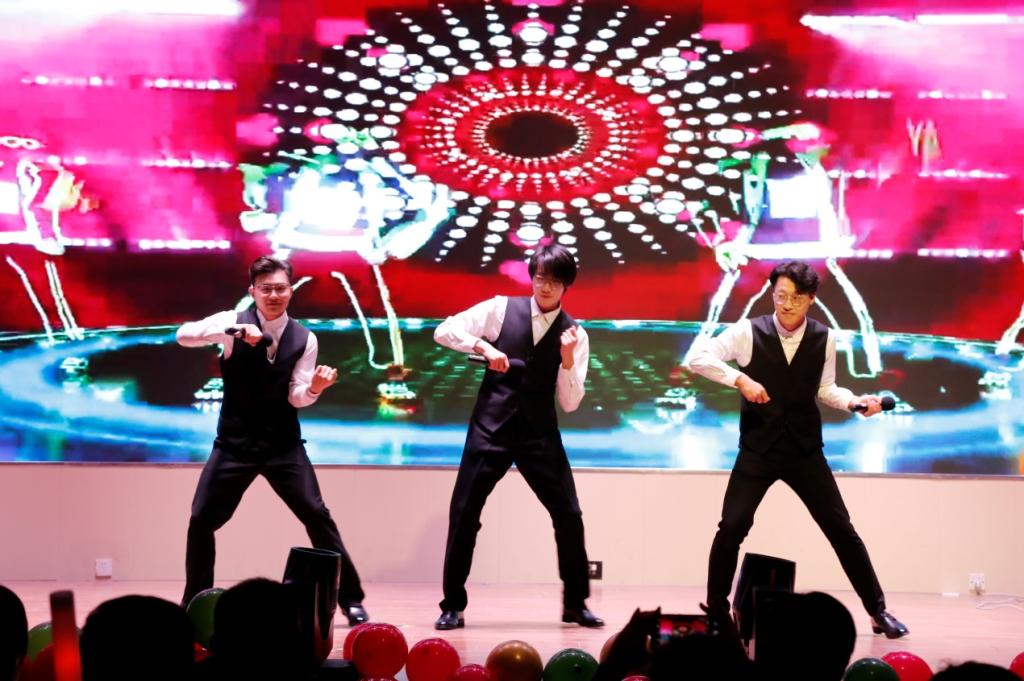 晚会在充满激情的摇滚乐队表演中拉开序幕。相声《妙言趣语》幽默诙谐,表演生动有趣,让人不禁捧腹大笑;舞蹈串烧《少年美》和学生会主席团带来的舞蹈动感而欢快,将现场气氛推向高潮;歌曲《青苹果乐园》《爱如潮水》展现了当代青年的蓬勃朝气。器乐队带来的《我和我的祖国》,加深了师生们对祖国的热爱之情。
