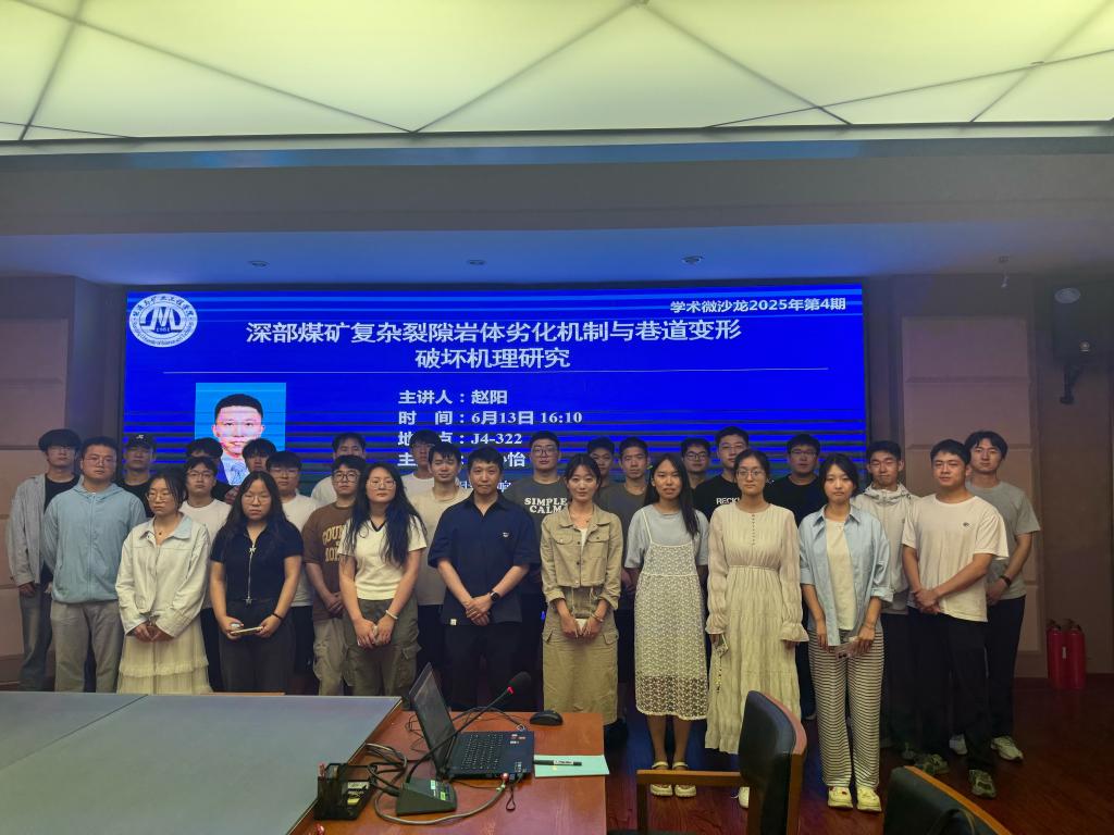 6月13日,第一版主 举办2025年第4期研究生学术微沙龙,学院博士研究生赵阳受邀为研究生作题为“深部煤矿复杂裂隙岩体劣化机制与巷道变形破坏机理研究”的报告。活动由学院研究生会学术科技部分管主席崔心怡主持。学院研究生代表参加活动。