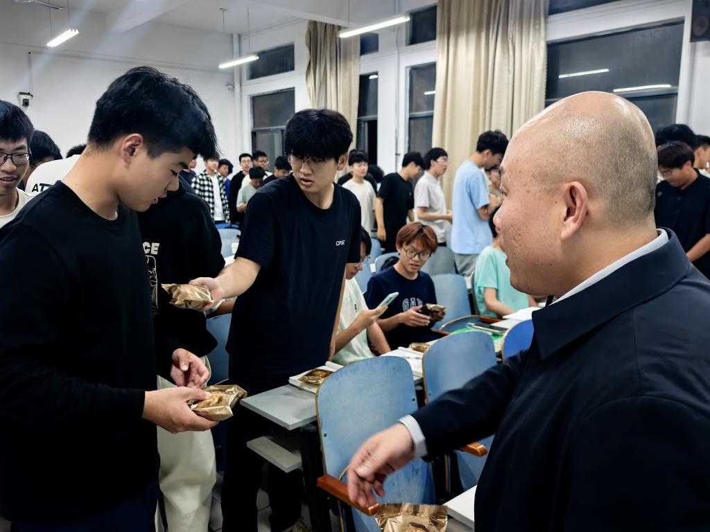 活动期间,班主任老师自发准备了水果、零食等慰问品,亲手将月饼和礼物送给每一位同学,并为同学们送上节日祝福,勉励同学们尽快融入大学生活的节奏,合理规划学业路径与生涯方向,以积极向上的精神面貌,直面人生新阶段的新生活、新考验。
