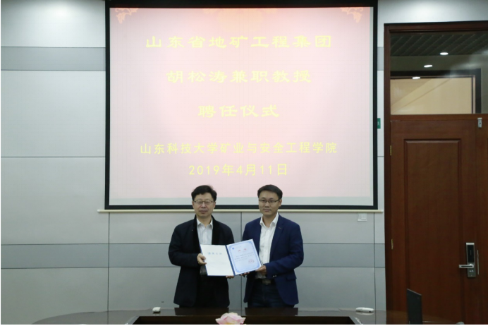 4月11日,山东省地矿工程集团副总经理胡松涛来校交流工作,矿业与安全工程学院院长谭云亮为胡松涛颁发兼职教授聘任证书。泰山学者优势特色学科领军人才沈宝堂教授,矿山灾害预防控制实验室副主任陈绍杰,矿业工程工作部党支部书记孙文斌以及新能源系教师等参加相关活动。