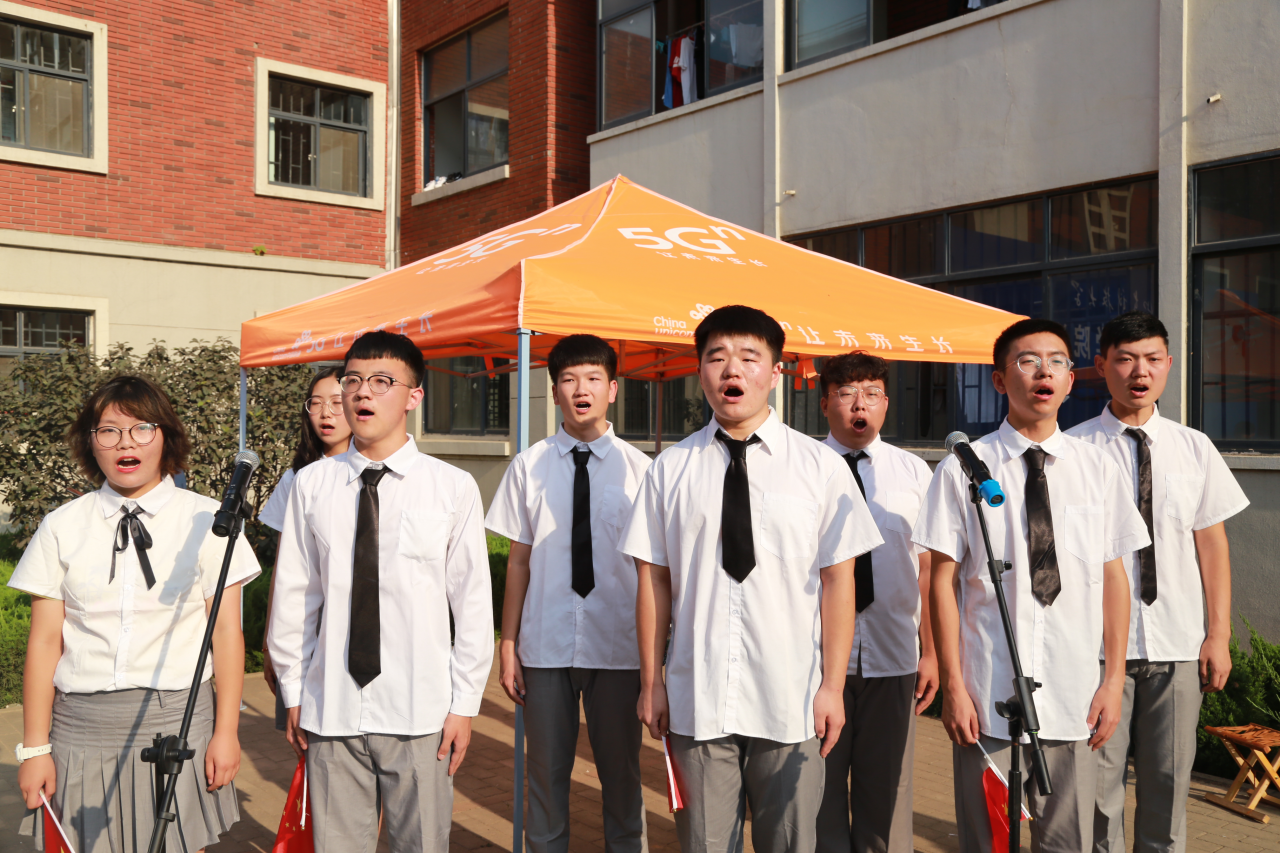 大会开始前,青年教师代表蒋力帅和学院大学生艺术团现场教唱《我和我的祖国》以及《第一版主 校歌》,对全体新生进行爱国爱校教育,献礼中华人民共和国成立七十周年。旋律响起,全体同学起立,满怀激情挥舞着国旗齐声放歌,用最美的歌声向祖国致敬,用最真挚的情感为科大颂歌。在激昂的歌声中,2019级新生们接受了开学第一课的洗礼,知时明势、放飞梦想,他们将在这里迈上人生新征程。