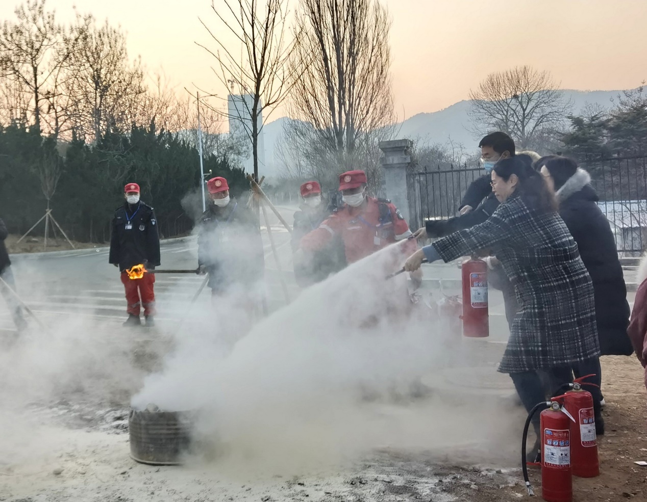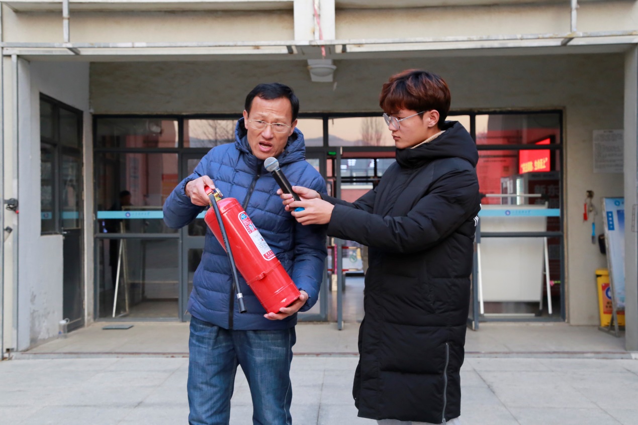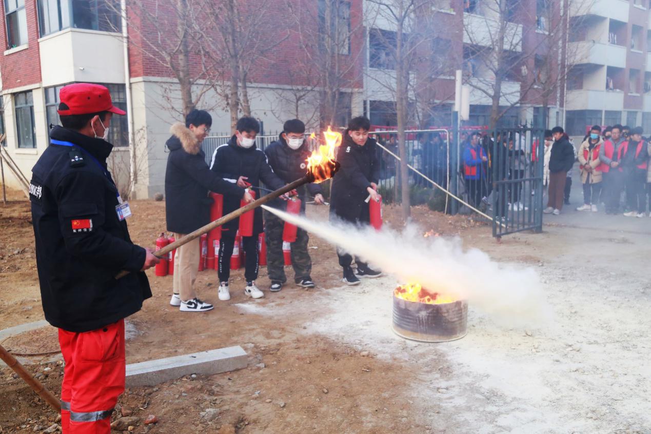 在安全管理处工作人员的指导下,老师和同学们亲自动手实践,模拟火灾发生时正确使用灭火器扑灭火情的场景。