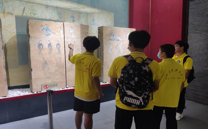 (图为“嵙创瑞沃”实践队队员在分享其所知的东平博物馆中的汉代壁画)