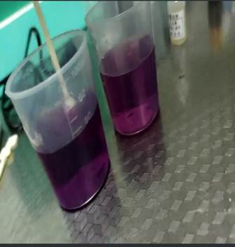然后为我们介绍了试剂的使用主要有两种方法,一种是加入摇匀,另一种是加入观察褪色情况。首先是PH试剂的使用,分别向装有纯净水和自来水的烧杯中滴入一到两滴PH试剂,观察两杯水的颜色变化,再根据比色卡查找对应PH,明显看出纯净水是偏酸性,自来水是偏碱性。