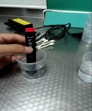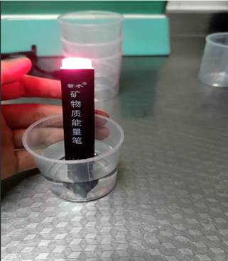 在本次会议中,祁帅东同学首先给我们介绍了矿物质能量笔。将矿物质能量笔分别放入装有纯净水和自来水的烧杯中,我们可以观察到放入纯净水中笔没有任何变化,而放入自来水中时,笔末端的指示灯就会变亮,这就说明自来水中的矿物质含量是比较高的。