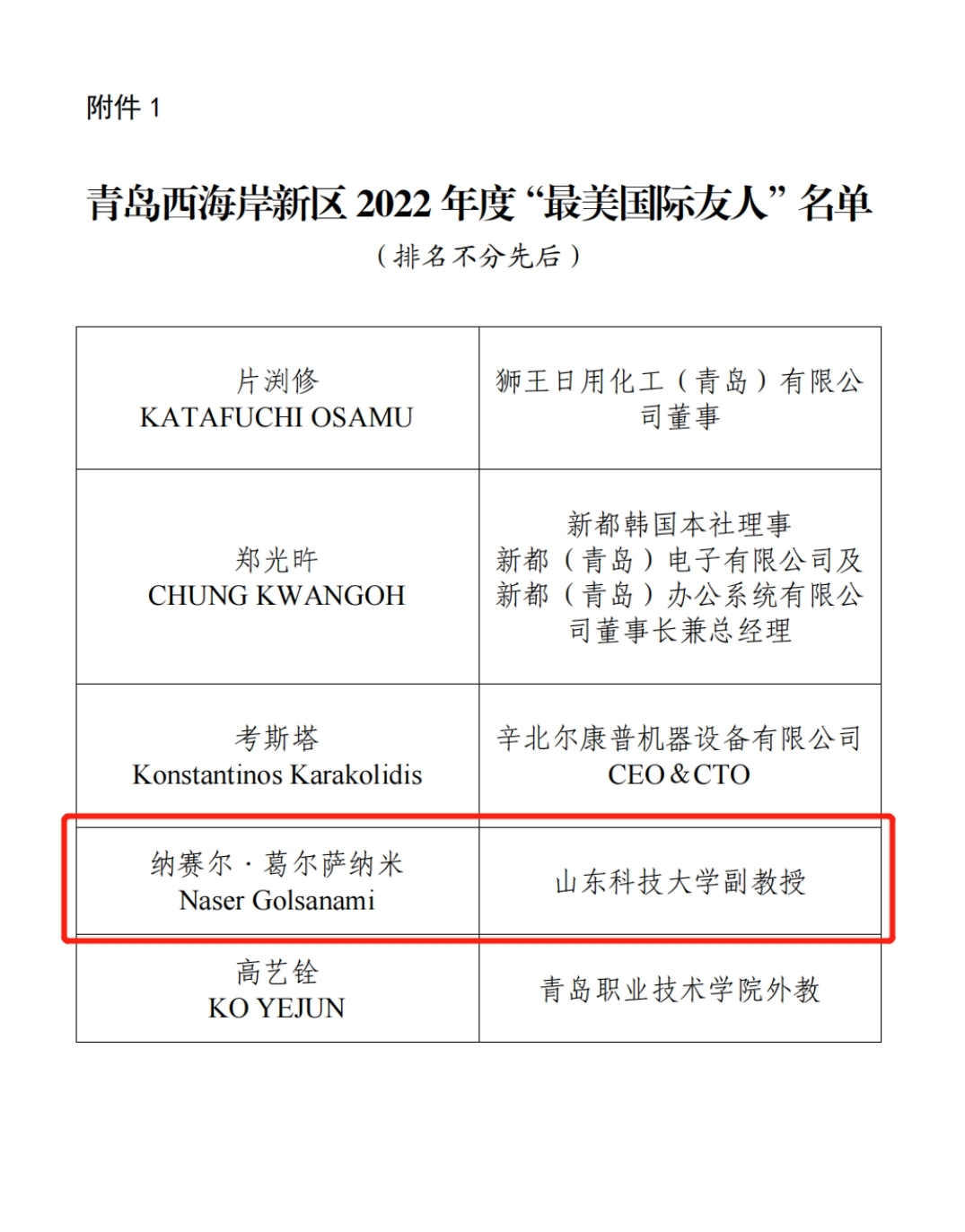 2月10日,中共青岛西海岸新区工委宣传部和青岛西海岸新区外事服务中心公布了关于青岛西海岸新区2022年度“最美国际友人”、“最美外事工作者”的通报。经过广泛宣传发动、优秀典型推荐、综合评价等评选程序,通过征求公安等有关部门意见,并公示无异议后,我院纳赛尔副教授荣获青岛西海岸新区2022年度“最美国际友人”荣誉称号。