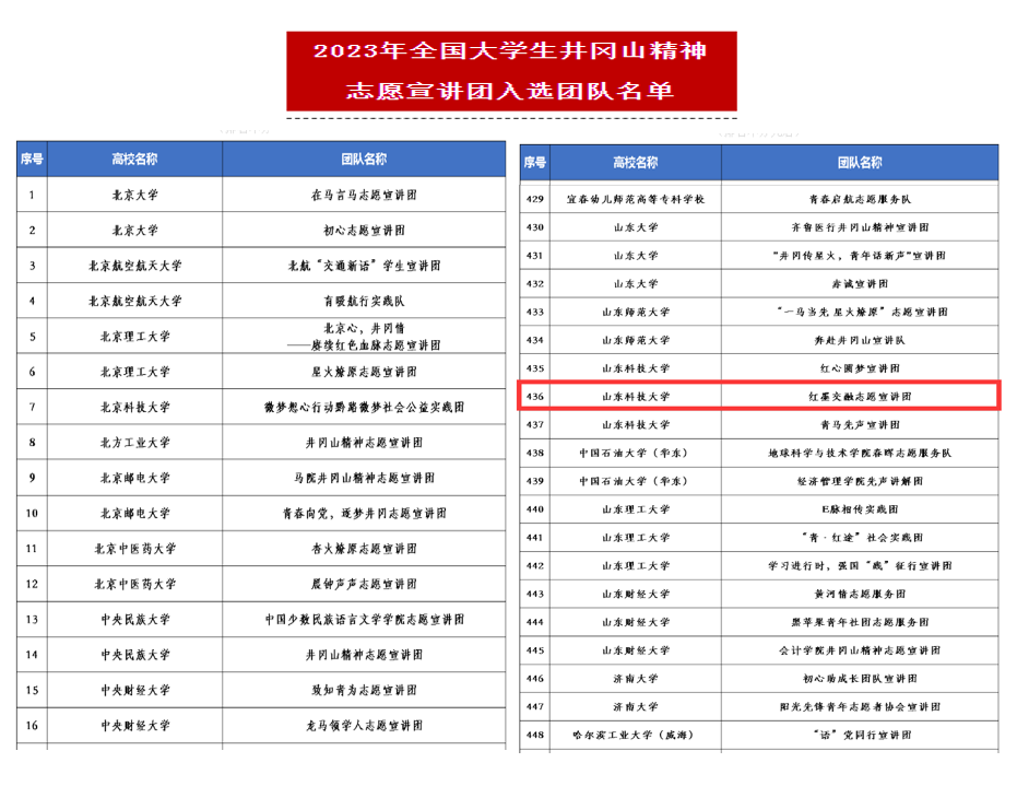 近日,团中央青年志愿者行动指导中心、全国青少年井冈山革命传统教育基地、井冈山管理局联合发布了《关于遴选2023年全国大学生井冈山精神志愿宣讲团的公告》,共有来自全国650所高校的1615支团队提交了申报材料,遴选出1000支大学生志愿服务宣讲团队,其中,我院红墨交融志愿宣讲团队成功入选。