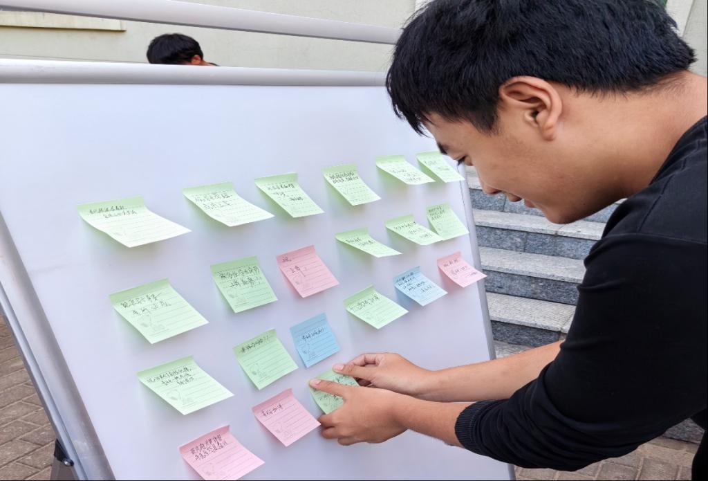 同学们在工作人员的引导下,为备考学子写下考研祝福语,并拼凑成“上岸”二字,在众多寄语中不仅有“吾尽吾心,终亦不悔;天道酬勤,何事难为”,“有志者,事竞成,破釜沉舟百二秦关终归楚;苦心人,天不负,卧薪尝胆三千越甲可吞吴”等动人心弦的句子,也有“前路浩浩荡荡,万事尽可期待”,“一‘研’为定”等通俗易懂的句子,将对备考学子的期许展于纸上。