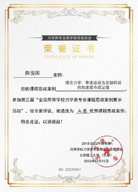 近日,教育部高等学校力学类专业教学指导委员会公布了第三届“全国高等学校力学类专业优秀课程思政案例展示活动”优秀课程思政案例的遴选结果。我校力学系陈俊国、杨坤和刘星光三位老师报送的三项案例均获评A类优秀课程思政案例。这是我校继去年获评两项A类优秀案例之后,取得的又一佳绩。