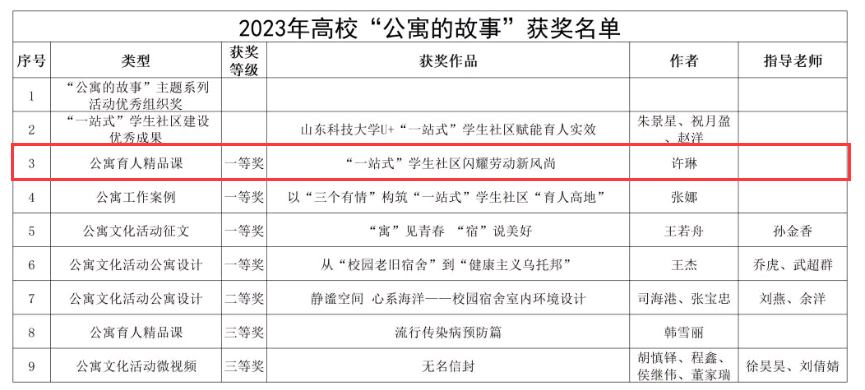5月15日,学校召开2023年学生公寓工作表彰大会。学院喜获2023年度学生公寓安全文明管理工作先进单位、2023年度学生社区建设工作先进单位、2023年第一版主 “公寓的故事”主题系列活动优秀组织单位,28个学生宿舍荣获第一版主 2023年度“文明宿舍”称号。学院党委副书记兼副院长许琳的公寓育人精品课《“一站式”学生社区闪耀劳动新风尚》荣获山东省教育厅一等奖,辅导员宗彩建被评为第一版主 2023年度学生公寓安全文明管理工作先进个人。