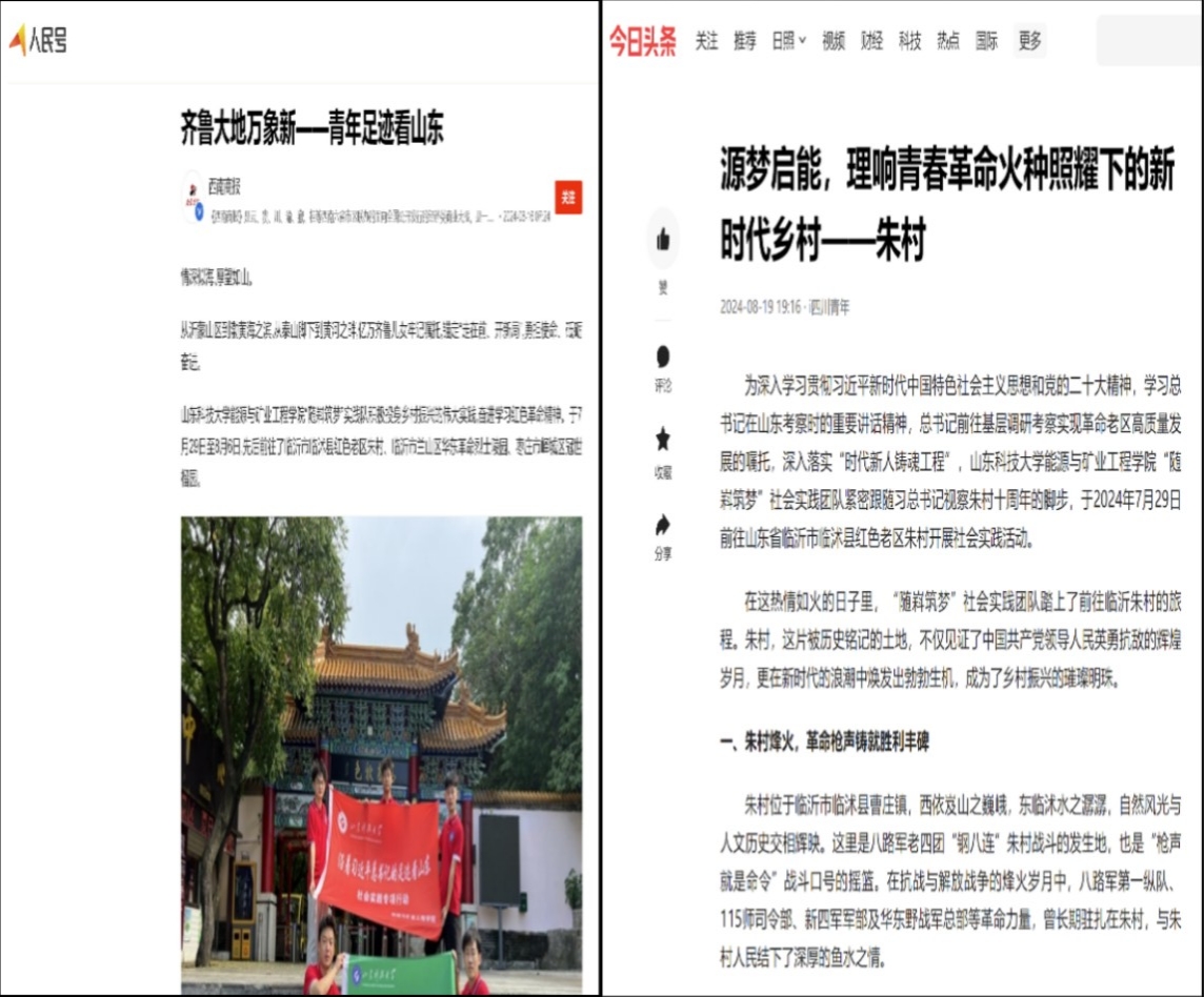“随嵙筑梦”团队前往临沂市临沭县红色老区朱村、临沂市兰山区华东革命烈士陵园和枣庄市峄城区冠世榴园等地区,从经济发展、文化繁荣、生态文明建设等多个方面进行实践调研,受到人民日报、搜狐网、今日头条、济南教育电视台等30家主流媒体的报道;“红墨交融”实践服务队前往山东省滨州市、菏泽市和日照市深入探寻黄河流域绿色能源发展现状,积极联系黄河流域能源企业,自2021年起,共计前往8省17市,实地走访了8家大型能源集团,42对生产矿井,调研图片、视频等资料1800余张;阳光同行实践团前往临沭县沿着习近平总书记的足迹,参观了朱村历史文化陈展室、八路军老四团钢八连朱村纪念馆等红色革命遗址,认真学习了总书记提出的沂蒙精神,深入了解了“第一碗饺子祭英烈”“枪声就是命令”等红色革命事迹与传统。