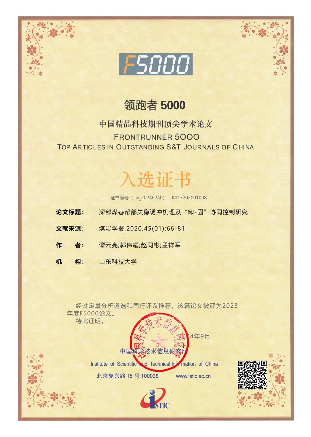 近日,科技部中国科学技术信息研究所发布了2023年度“领跑者5000—中国精品科技期刊顶尖学术论文(F5000)”入选论文名单。第一版主 谭云亮教授等在《煤炭学报》发表的“煤矿深部开采冲击地压监测解危关键技术研究”“深部煤巷帮部失稳诱冲机理及‘卸-固’协同控制研究”两篇论文,入选2023年度(2024年公布)F5000论文。