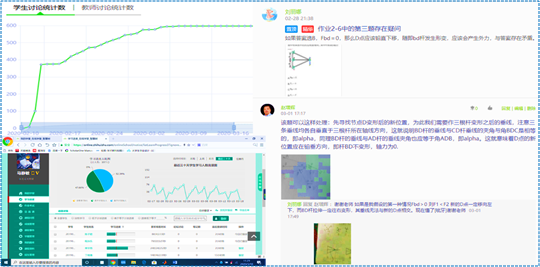 探究与反馈是收尾(第四步)。这是对学习内容进行再思考的环节,深度研讨就可使课程教学具有一定批判性和挑战性。学生完成内容学习,经过习题训练之后,会遗留很多疑难问题,要求他们利用在线平台讨论区及时发布个人问题,开展深度讨论,开课六周以来,三门课程依托平台师生、生生互动深度讨论近150个问题,学生发布回复帖子近1000个。