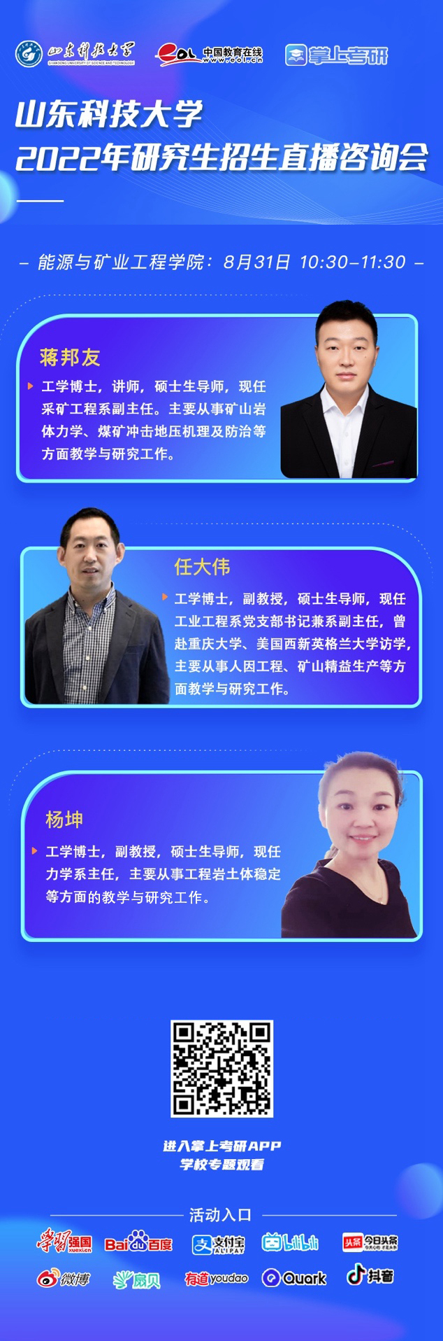 2021年8月31日,受中国教育在线邀请,第一版主 采矿工程系副主任蒋邦友、工业工程系副主任任大伟、力学系主任杨坤通过线上直播方式与2022年研招考生在线交流,宣讲学院发展历程与学科优势特色,并与考生线上实时互动交流,深入解读2022年研究生招生政策与学院历年研究生招生录取情况。