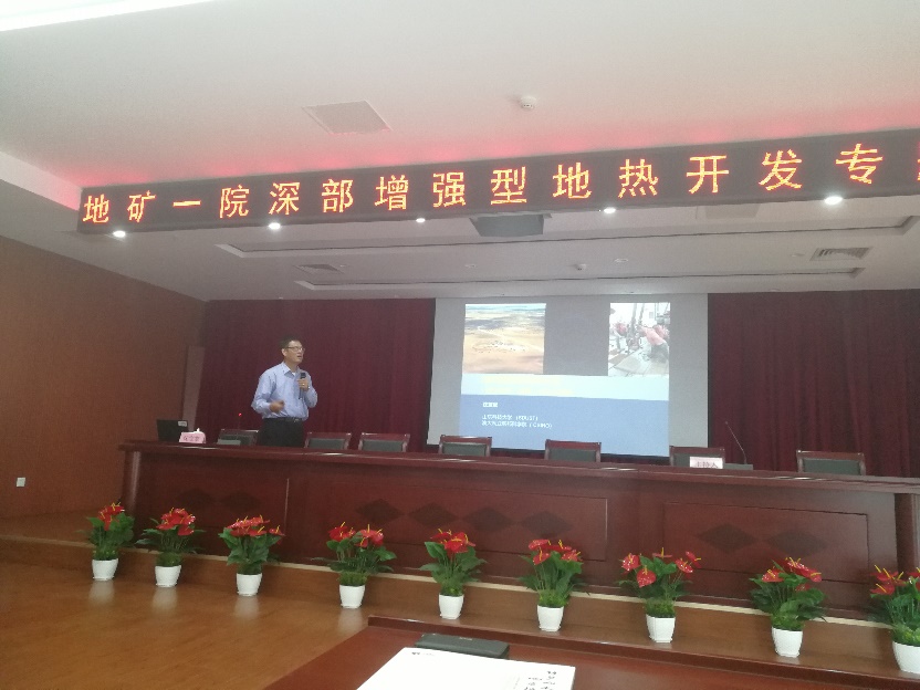 沈宝堂教授首先感谢地矿一院邀请,介绍了当前国际上增强型地热系统开发的经验和教训,同时表示,学院与地矿一院可以开展广泛的合作研究,尤其以威海文登干热岩施工现场为试验基地,在深层地热开发领域进行深入的合作。常洪华院长对矿业与安全工程学院一行表示热烈欢迎,介绍了地矿一院各部门的运营情况、威海文登干热岩施工现场钻孔情况,他表示,地热能作为一种清洁能源,其开发是企业、高校、政府共同关注的焦点,是国家打赢蓝天保卫战的有效途径,地矿一院将积极推进与科技大学的合作交流,为生产中的理论和科技创新助力。