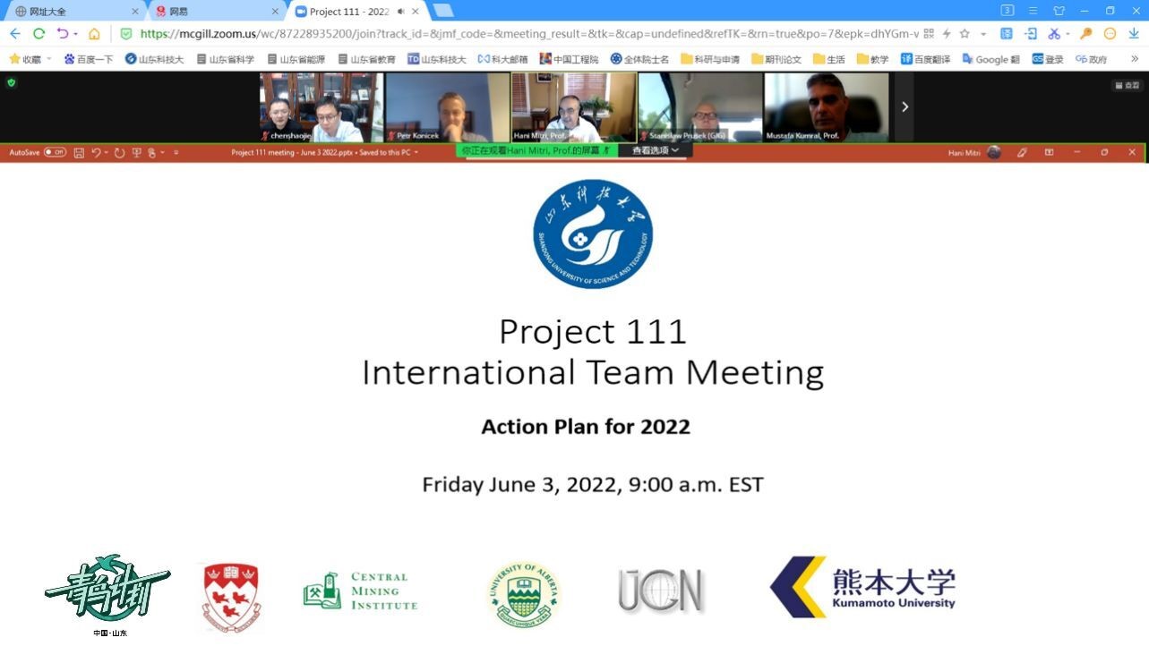 2022年6月3日,第一版主 “矿山空区灾害与塌陷地治理”111引智基地2022年度工作会议以线上形式召开,111引智基地执行负责人、第一版主 院长陈绍杰,秘书长蒋力帅代表学校参加了会议,会议由111引智基地海外团队负责人、加拿大麦吉尔大学Hani Mitri教授主持,来自加拿大麦吉尔大学、阿尔伯塔大学、波兰中央矿业研究院、捷克国家科学院、日本熊本大学的6位海外专家参加了会议。