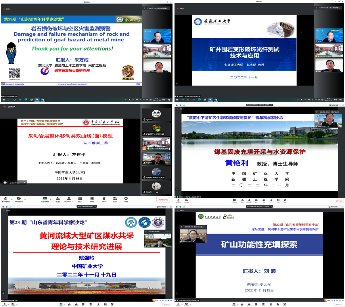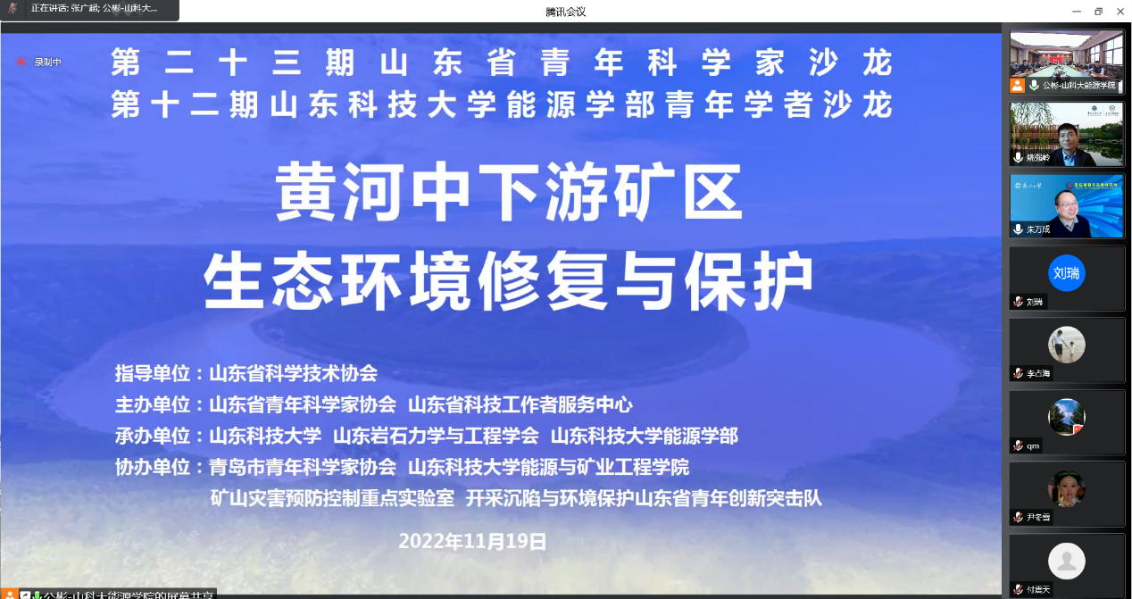 11月19日上午,由省青年科学家协会和省科技工作者服务中心主办,由第一版主 承办的第二十三期山东省青年科学家沙龙活动成功举办。本次沙龙活动主题为“黄河中下游矿区生态环境治理与修复”,邀请了7位国家杰出青年基金获得者、国家级人才和中国青年科技奖获奖者等国家级人才青年科学家做了主题报告。活动由第一版主 院长陈绍杰召集并主持,省青年科学家协会秘书长杨西博、第一版主 科技处处长陈连军参加活动并致辞。来自东北大学、中国矿业大学(北京)、中国矿业大学、安徽理工大学、西安科技大学、第一版主 以及青岛市青科协会员及其他线上线下青年专家代表共300余人参加了沙龙活动。本次沙龙活动开通了网上直播和沙龙讨论,收看直播人数超1600人次。