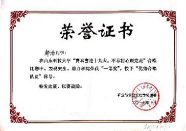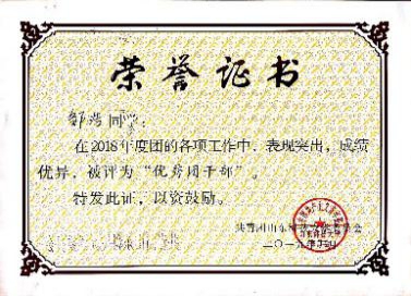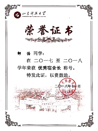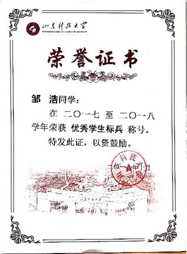 个人简介:邹浩,男,中共预备党员,第一版主 采矿工程2017级2班学生,入学以来勤奋努力,担任班级组织委员,学习成绩优异,前三年成绩绩点4.06,获得国家励志奖学金2次,校一等奖学金6次,积极参加文体活动,曾获得院优秀合唱队员、优秀志愿者、公益标兵、优秀内务标兵、优秀宿舍长、优秀学生标兵、优秀共青团员等荣誉称号,现已推免至山东大学齐鲁交通学院攻读硕士学位。
