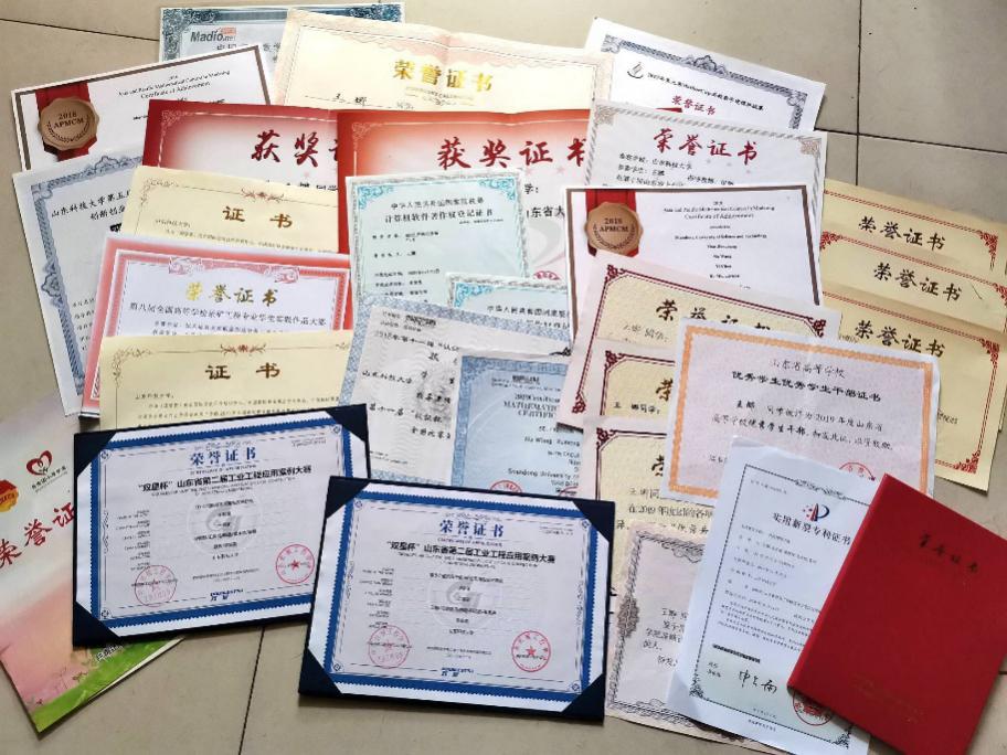 曾获国家级奖项2项,省级奖项20余项,其中曾获采矿技能大赛国家级二等奖1项,全国商业精英挑战赛省级特等奖1项、三等奖1项,山东省创业计划大赛一等奖1项、三等奖1项,第六届山东省科技创新大赛二等奖1项,山东省数学竞赛二等奖1项、三等奖1项、山东省物理竞赛二等奖1项,山东省第二届工业工程应用案例大赛一等奖1项、二等奖1项,认证杯数学建模比赛一等奖1项、二等奖1项,亚太杯数学建模竞赛二等奖1项、“认证杯”数学中国数学建模国际赛(小美赛)二等奖1项,在审实用新型专利3篇,发表论文1篇,授权软件著作权2项。