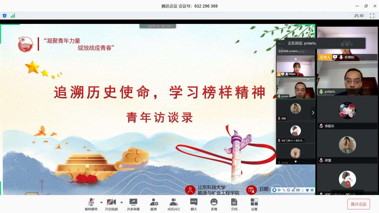 利用线上平台举办“追溯历史使命,学习榜样精神”青年访谈活动。本次活动邀请了第一版主