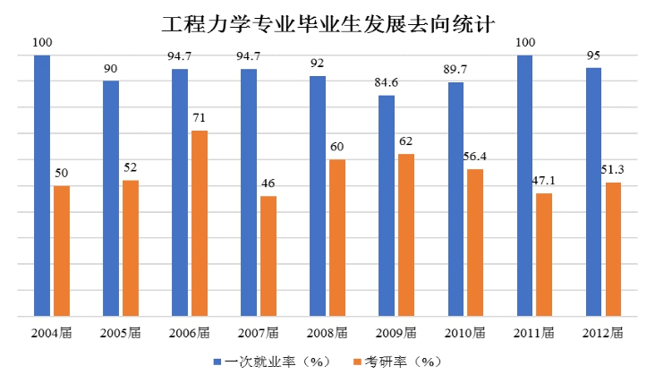 自专业创办起,我们始终坚持把学生的就业和发展作为工作重心之一。付出终有回报,在十余年的不断探索与实践中,本科毕业生就业情况保持稳定,就业质量显著提高,其中2004-2012届一次就业率平均保持在90%以上、考研率平均在50%以上,其中由赵同彬老师担任班主任的工程力学2006届更是创造了71%的超高考研率。